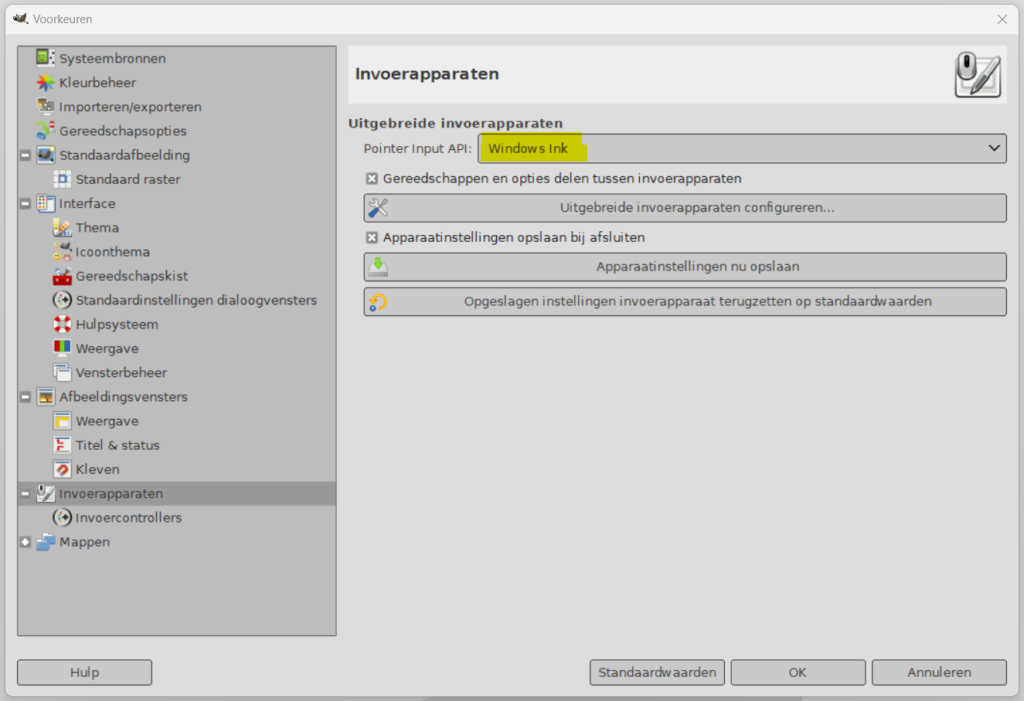 Het is nu mogelijk om in de Gimp voorkeuren bij invoerapparaten de instelling “Windows Ink” in te stellen (zie afbeelding hieronder) Met deze instelling werkt je tablet mogelijk nog beter samen met Gimp. Vooral de drukgevoeligheid, trage beweging van de cursor en een eventuele foute plaatsing van de cursor in je scherm, is hiermee opgelost.